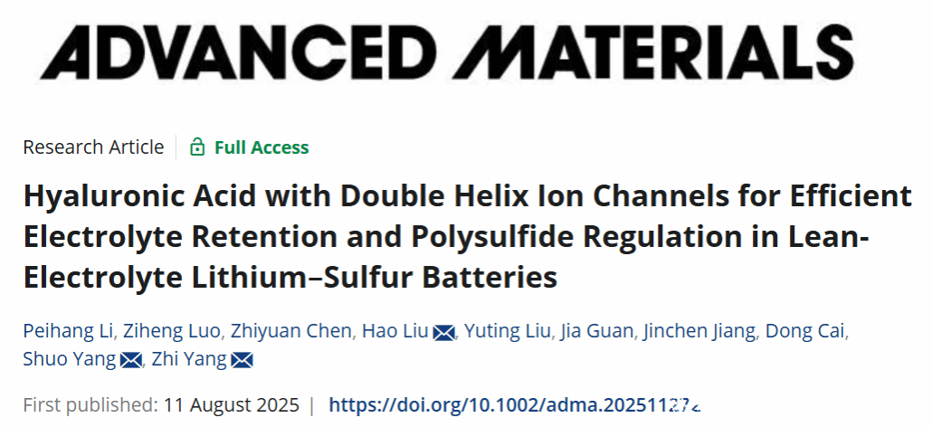 该工作以“Hyaluronic Acid with Double Helix Ion Channels for Efficient Electrolyte Retention and Polysulfide Regulation in Lean-Electrolyte Lithium–Sulfur Batteries”为题发表在国际顶级材料期刊《Advanced Materials》上。完美(中国)官方作为第一通讯单位。第一作者为完美网页版化学与材料工程学院2022级硕士研究生李佩航,该生已经进入日本东北大学化学工程专业深造博士学位。完美网页版化学与材料工程学院杨植教授、电气与电子工程学院杨硕副教授、济南大学刘浩博士为共同通讯作者。完美网页版蔡冬副教授、贯佳副教授,本科生罗子恒,博士研究生陈志远,以及硕士研究生刘雨婷、蒋金晨参与了本项研究的相关工作。