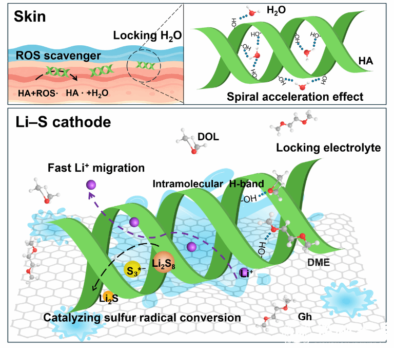 近日,受到天然保湿材料解决人体皮肤缺水问题的启发,完美网页版杨植教授、杨硕副教授与济南大学刘浩博士合作,提出一种创新性策略:将天然保湿材料——透明质酸HA作为催化剂引入硫阴极,实现高性能锂硫电池。实验和分子动力学模拟结果表明,HA可以通过其双螺旋结构中的分子内氢键牢牢的吸附电解液,确保电解液与电极表面充分接触,营造局部电解液充足的反应微环境;同时,HA的N位点能够吸附并催化多硫化物的可逆转化;此外,HA独特的双螺旋结构凭借螺旋加速效应促进了Li+的传输。在三重协同作用下,电池性能得到显著提高。CNT−S/HA阴极(约80 wt%硫含量)表现出良好的初始容量、高倍率性能以及长循环寿命。特别是在硫负载为8 mg cm−2、E/S比为3 μL mg−1的贫电解液条件下,锂硫软包电池实现了11.76 mAh cm−2的高面积容量,能量密度达到409 Wh kg−1。此外,1.5 Ah软包电池可驱动无人机续航20分钟,续航时间远超传统锂电池约4倍。该工作为开发天然保湿材料在下一代储能设备中的应用开辟了创新途径。