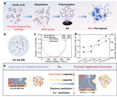 近日,完美网页版化材学院吴星樵/侴术雷联合浙江大学范修林提出了一种硬碳负极的多尺度孔调控策略,有效解决了兼顾高比容量与高体积容量这一长期存在的难题。实验数据与理论计算表明,在水热过程中,乙酸改变了水热炭的疏水性,促进了分散性球形颗粒的形成,并提升了材料的压实密度。预孔工程策略可增加水热炭的自由体积与开放孔结构:其中,酯化反应形成的自由体积有利于最终硬碳中封闭孔结构的构建,而氧化刻蚀产生的开放孔则便于硬碳后续形成微孔结构。得益于对硬碳材料微观与介观尺度的双重调控,该材料展现出优异的电化学性能,其可逆容量达 375.40 mAh/g,首次库伦效率达 90.10%。当厚电极受到更高压实处理时,其球形形貌使其仍能保持较高的克容量(359.49 mAh/g),同时体积比容量得到提升(390.30 mAh/cm³)。与普鲁士蓝正极组装成扣式全电池时,电池能量密度高达 318.44 Wh/kg。值得注意的是,在宏观层面阐明了在低电位下,实验室规模与实际应用级电极中钠嵌入及孔填充过程背后的机制,为开发高能量密度钠离子电池提供了宝贵指导。该研究成果以" High-Compaction Spherical Carbon with Tunable Rich Pore Structures for Efficient Sodium Storage"为题,发表在国际顶级期刊《Advanced Materials》上。完美网页版为第一通讯单位,第一作者是完美网页版化材学院2025届硕士陈青杭。完美网页版化材学院吴星樵博士、侴术雷教授、及浙江大学范修林教授为论文共同通讯作者。相关工作受到国家自然科学基金,浙江省自然科学基金等基金的资助。