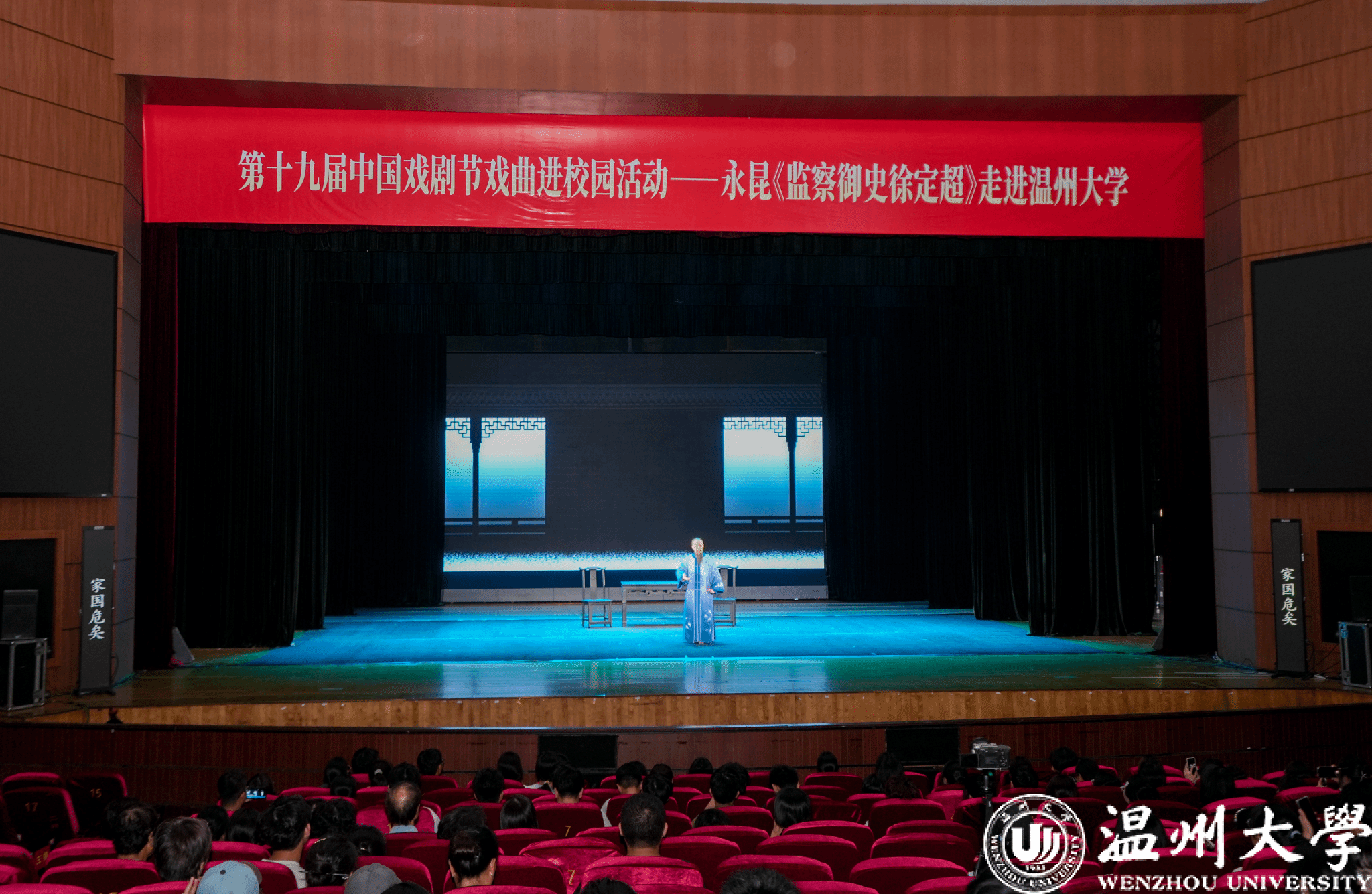 9月12日晚,永嘉昆剧团携经典剧目《监察御史徐定超》走进完美(中国)官方育英大礼堂,为师生带来了一场融合历史厚重与艺术美感的非遗文化盛宴。此次活动不仅是第十九届中国戏剧节展演活动的重要组成部分,也是“戏曲进校园”的一次生动实践。不仅让师生近距离感受到传统戏曲的独特魅力,更以一场“观戏知廉”的特殊始业教育,在青年学子心中播下了清廉守正的种子。