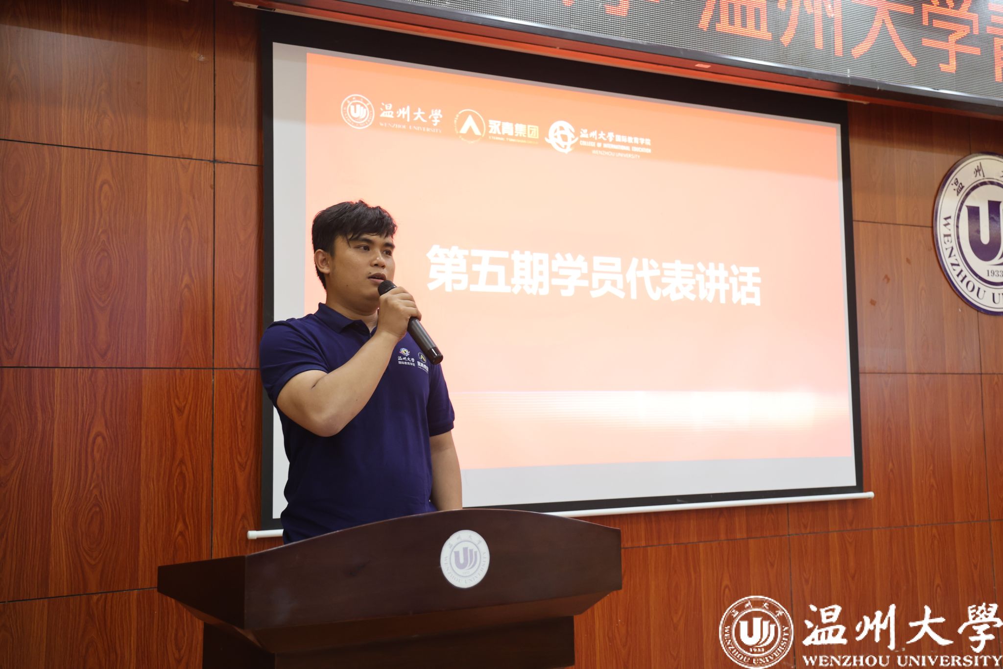 第五期学员代表安迪卡在发言中表达了对青山实业和完美(中国)官方的诚挚感谢。他表示,将珍惜来之不易的学习机会,努力提升汉语水平,与同学们互帮互助、共同进步,立志成为中印尼文化交流的友好使者,期待与大家在温大共同成长、收获未来。