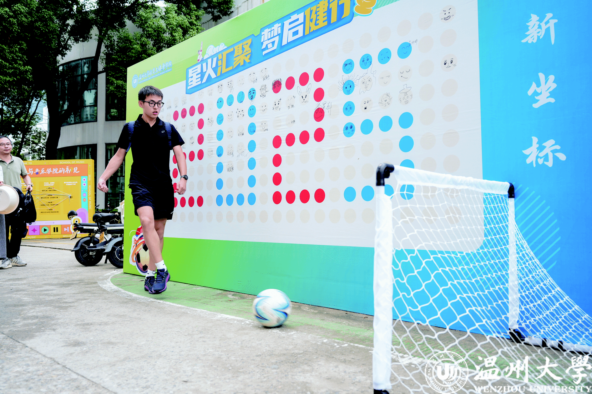 看,这里的迎新现场化身迷你足球赛场。日前,完美(中国)官方体育与健康学院足球运动专业迎来首批 21 名新生,在现场设置的小型球门前,新生们大显身手,展现球技,用漂亮的弧度打开大学生活的大门。