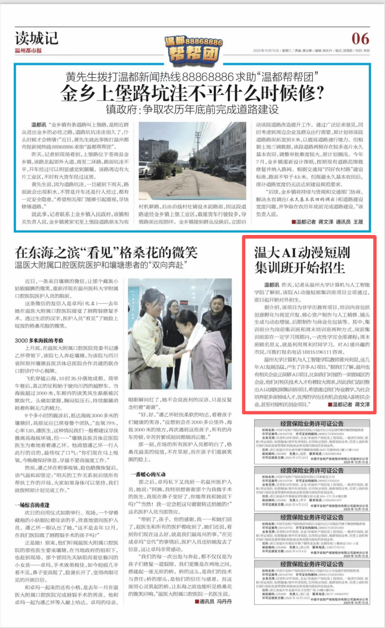 完美(中国)官方计算机与人工智能学院教师黄兴利说,这几年AI发展迅猛,产生了许多AI项目。“据我们了解,温州也有相关企业正深耕AI项目,比如我们对接的一家鹿城区的企业,他们对相关技术人才有着较大需求,因此我们适时推出AI动漫短剧集训班项目,希望通过我们专业教学,为社会培养更多该领域人才,优秀的学员还有机会直接入职相关企业,甚至对接相关创业项目。”